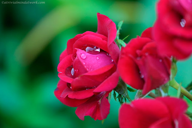 Our little red rose bush continues to surprise us with its bounty of flowers. Getting them just after the rain is just the icing on the cake!
