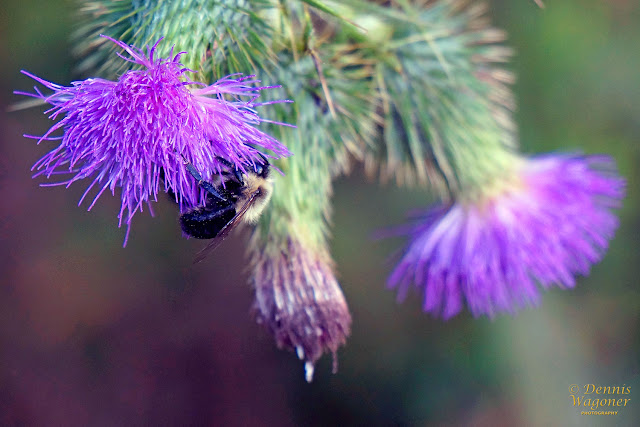 This bumblebee bounced among the thistles picking up specks of pollen as he worked!