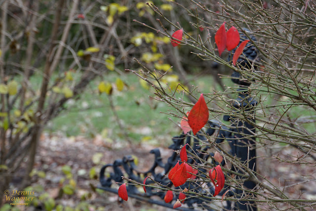 Just playing around with the camera with this capture of the few remaining red leaves and the wrought iron post in the background!